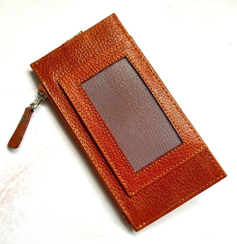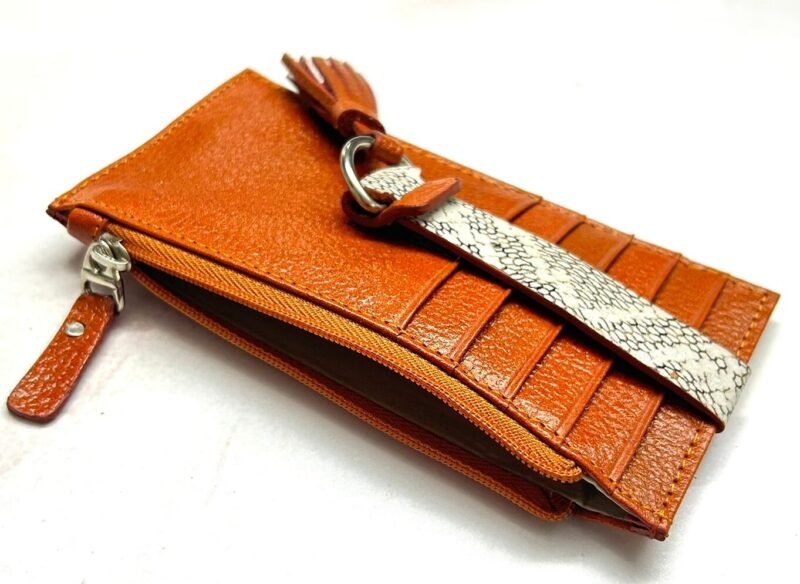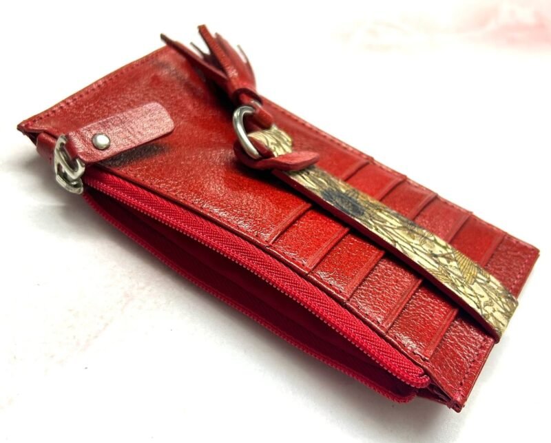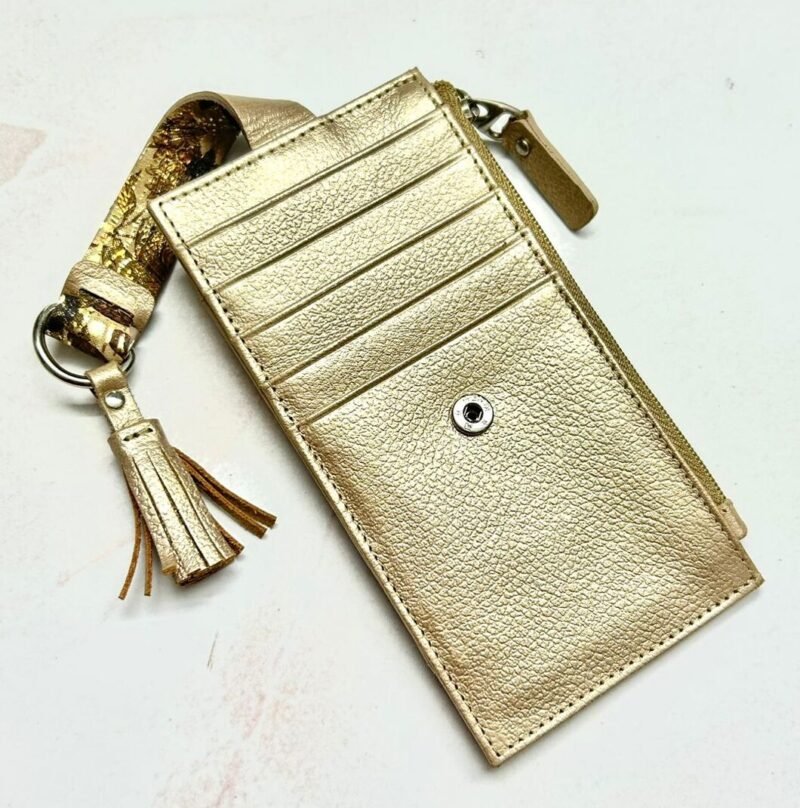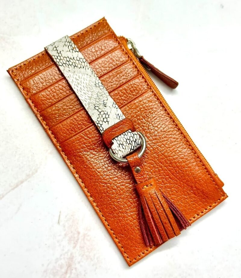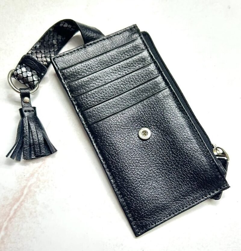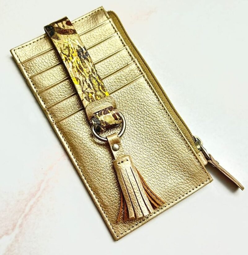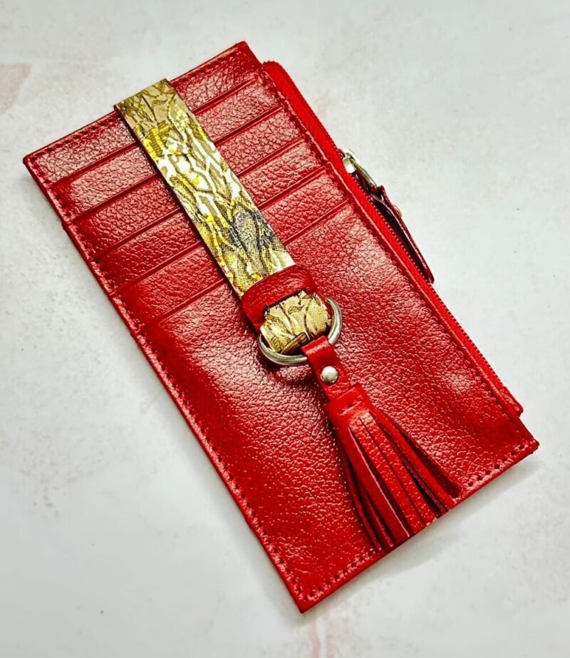 Su amplitud permite organizar cómodamente una gran variedad de tarjetas, además cuenta con un espacio para monedas. Elaborado con cuero de alta calidad y acabados finos que reflejan sofisticación, este tarjetero combina practicidad con un toque moderno y femenino, ideal para acompañarte en cualquier ocasión